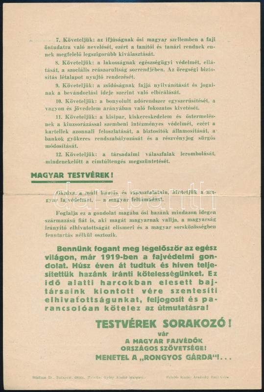 Description: cca 1939 Fajvédők! Sorakozó! Mi a fajvédelem? A Magyar Fajvédők Országos Szövetsége, a "Rongyos Gárda" kétoldalas röplapja, Bp., Stádium-ny., hajtott, kis szakadással, 23x15 cm