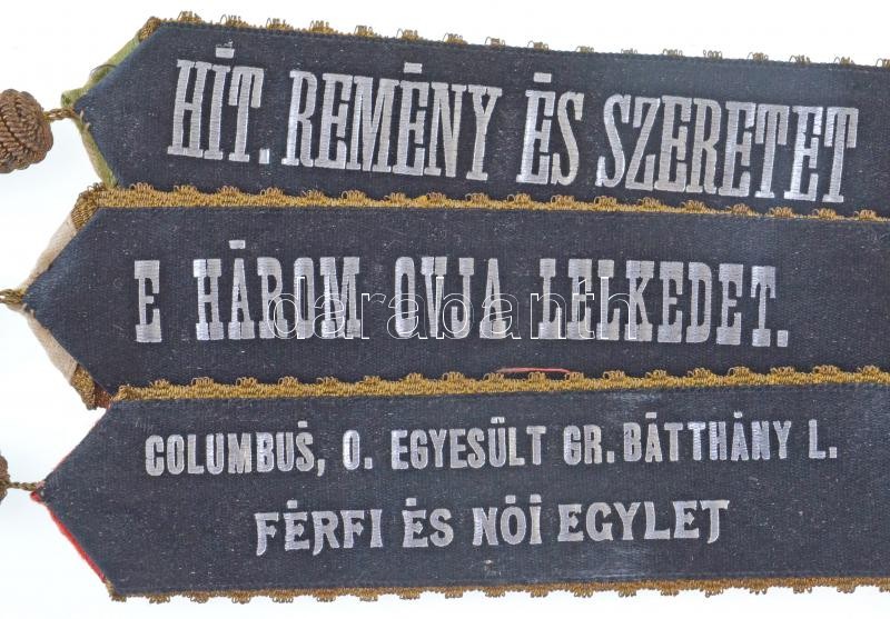 Amerikai Egyesült Államok / Ohio / Columbus DN "Éljen a Haza" amerikai-magyar zászlós nyomatú jelvény, eredetileg, azóta kifakult piros-fehér-zöld szalagokon "Hit, Remény és Szeretet - E három óvja lelkedet - Columbus, O. Egyesült Gr. Batthány L. Férfi és Női Egylet" felirattal, amerikai magyar szervezet nagyméretű díszes jelvénye T:2 / USA / Ohio / Columbus ND "Éljen a Haza" with US-Hungarian flags imprinted badge, on originally - since the faded - red-white-green ribbons with "Hit, Remény és Szeretet - E három óvja lelkedet - Columbus, O. Egyesült Gr. Batthány L. Férfi és Női Egylet" inscription. Large-size badge of Hungarians Association in the United States C:XF
