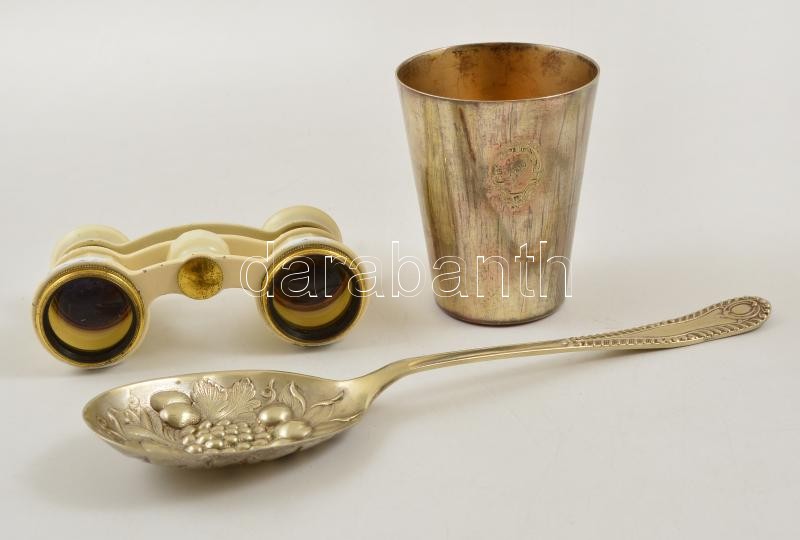 Kis vegyes bolha tétel: régi távcső, díszes szószos kanál, keresztelőpohár