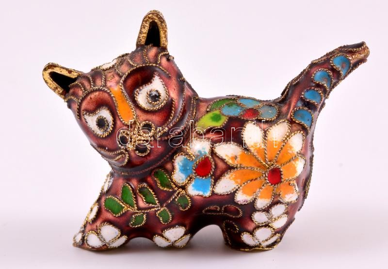 Zománccal díszített réz cicafigura, 6×4 cm
