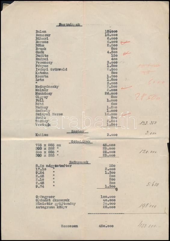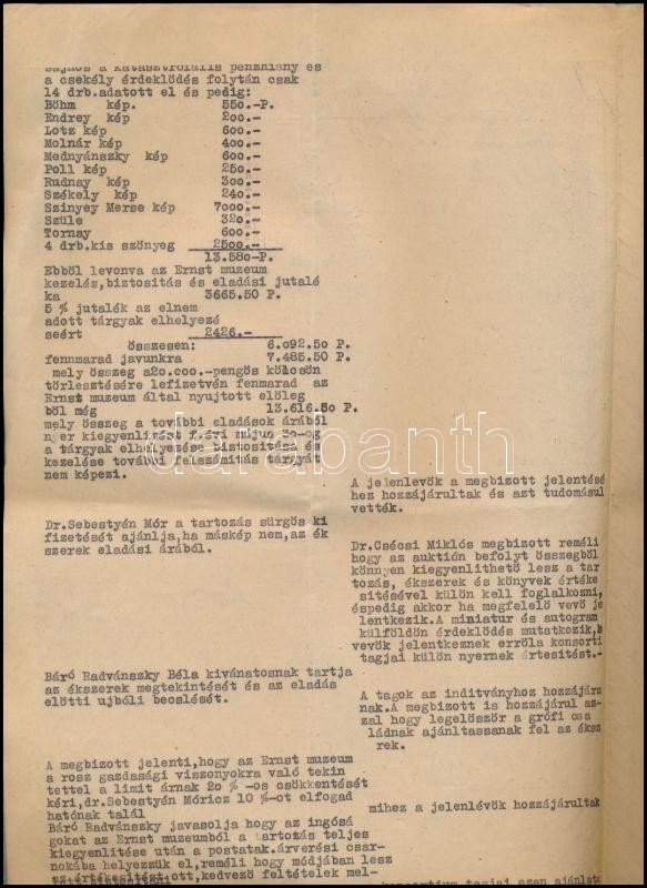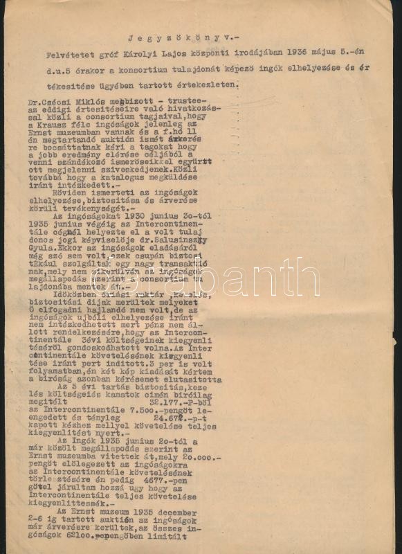 1936 Krausz Simon ingóságainak árverezésével kapcsolatban felvett jegyzőkönyv és az igen értékes magyar festmények listája, árakkal 8 p.
