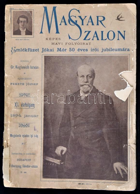 Description: 1894 Magyar Szalon. Képes havi folyóirat. XI. évf. 1894. január. Kiadja: Keglevich István. Szerk.: Fekete József. Emlékfüzet Jókai Mór 50 éves írói jubileumára. A hátsó borító hiányzik, az elülső borító szakadt, az első pár lap szakadt. Hasábos számozással, 10+677-936 p.