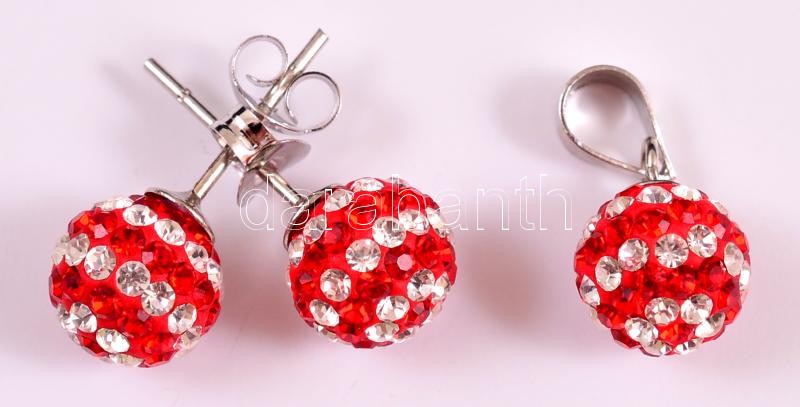 Piros-fehér shamballa gyöngyökkel díszített fülbevalópár és függő, ezüst(Ag) szerelékkel, jelzett
