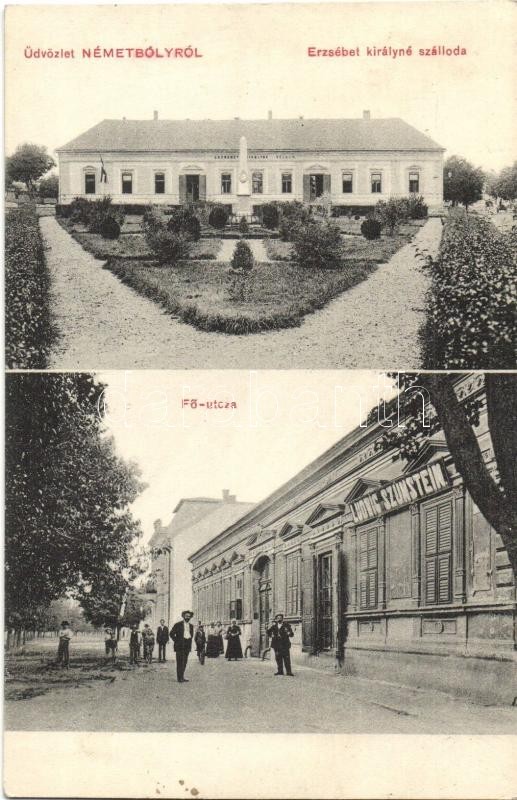 Bóly, Németbóly; Erzsébet királyné szálloda, emlékmű, Fő utca, Ludwig Szünstein üzlete, Szünstein Lajos kiadása