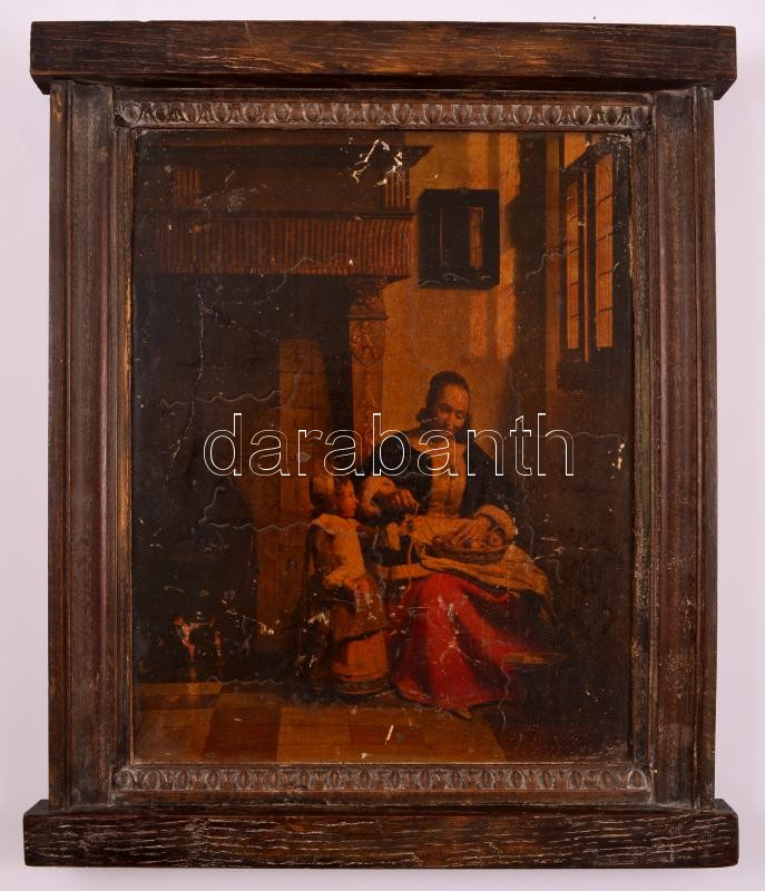 Díszes fa keret, benne olajnyomattal, belső méret: 21×26,5 cm, külső méret: 28×34 cm
