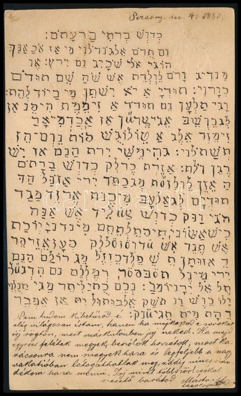 1885 Pozsony, azonosítatlan teológus magyar nyelvű, nagyrészt héber betűkkel írt levelezőlapja Orowán Berthold (1863-1933) gépészmérnöknek Vághévére