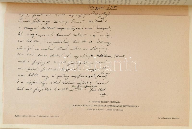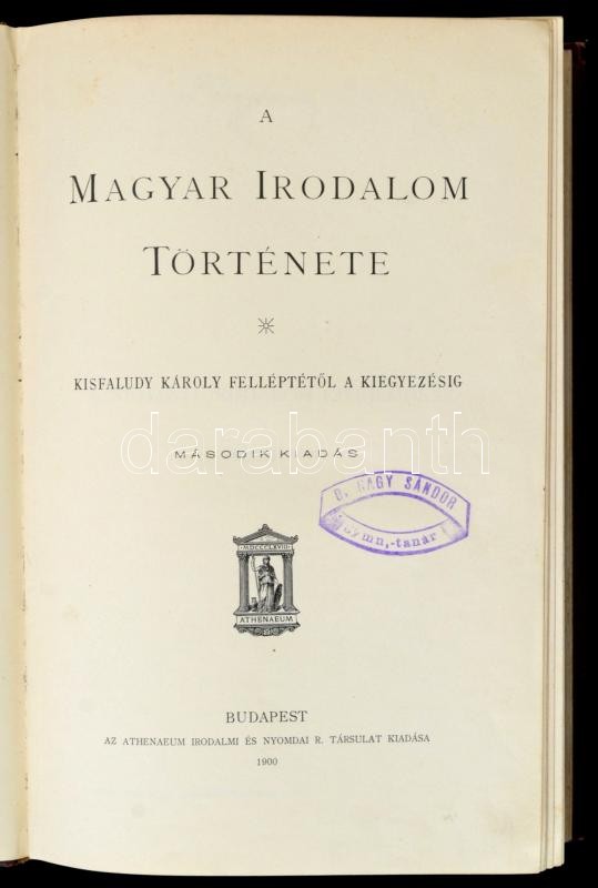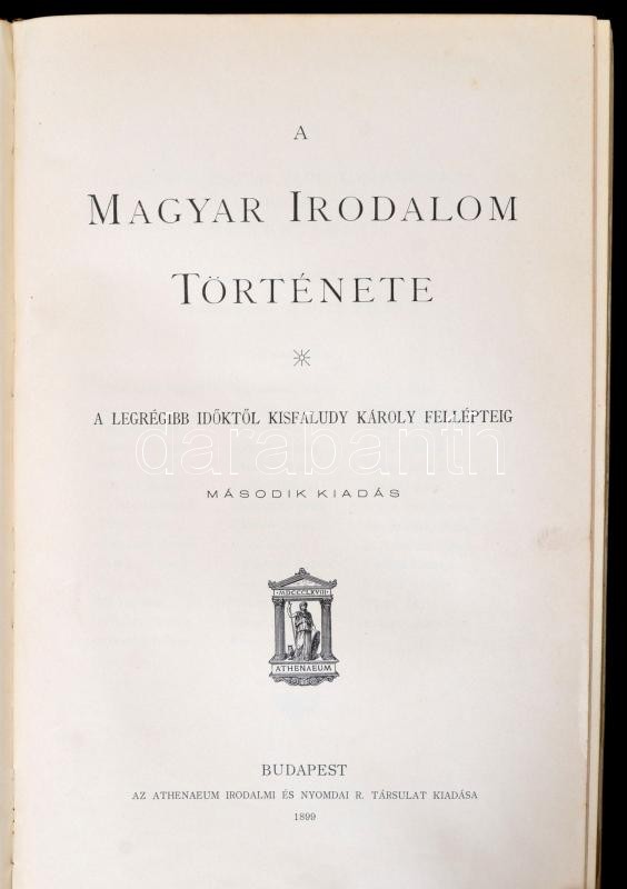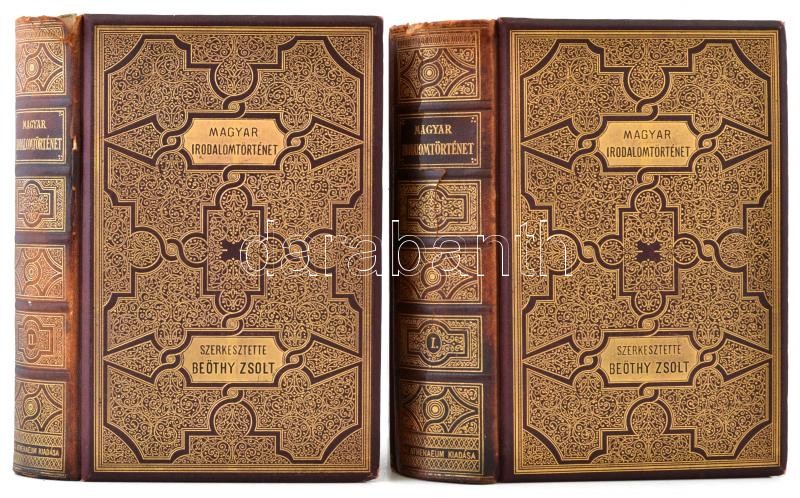 Beöthy Zsolt (szerk.): A magyar irodalom története I-II. kötet. Képes díszmunka két kötetben. I. kötet: A legrégibb időktől Kisfaludy Károly felléptéig. II. kötet: Kisfaludy Károly felléptétől a Kiegyezésig. Bp. 1899-1900, Athenaeum, 8+852 p.+ 58 t.; 4 + 683 + 34 t. hasonmás. Második kiadás. Díszesen aranyozott kiadói félbőr kötés, Athenaeum-kötés, a borítókon és a gerinceken kis kopásnyomokkal, az I. kötet gerincén törésnyommal, az I. kötet hátsó tábláján törésnyommal, kijáró lapokkal (73.-75.,134.-139.), a II. kötet gerincén kis sérülésekkel.