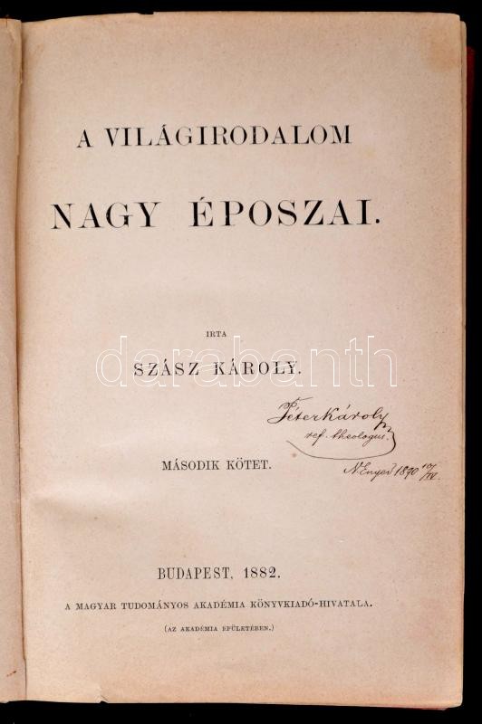 Description: Szász Károly A világirodalom nagy époszai II. kötet. Bp.,1882, MTA. Kiadói aranyozott egészvászon-kötés, kissé kopott borítóval. "Péter Károly református teológus, Nagyenyed, 1890. IV. 10" tulajdonosi bejegyzéssel.