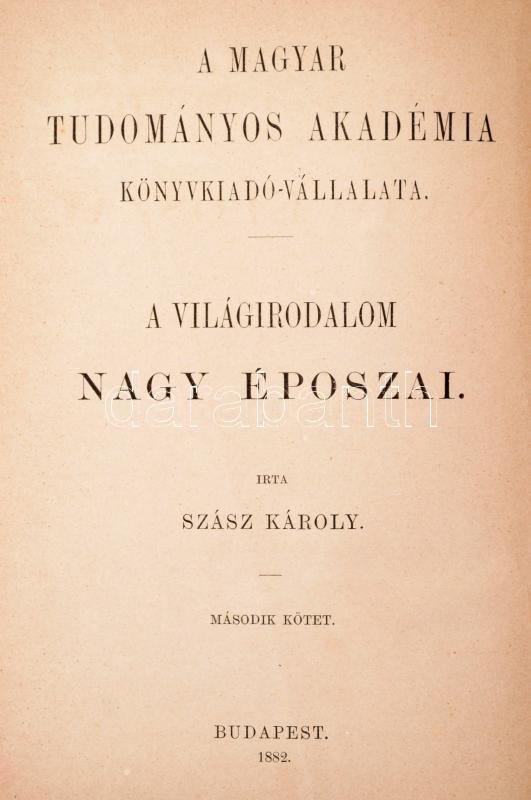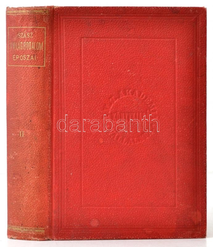 Szász Károly A világirodalom nagy époszai II. kötet. Bp.,1882, MTA. Ki... https://www.darabanth.com/en/341-Online-auction/341.0/Books/Books-Other-rarities~1000018/Szasz-Karoly-A-vilagirodalom-nagy-eposzai-II-kotet-Bp-1882-MTA-Kiadoi-aranyozott-egeszvC3~II1842331