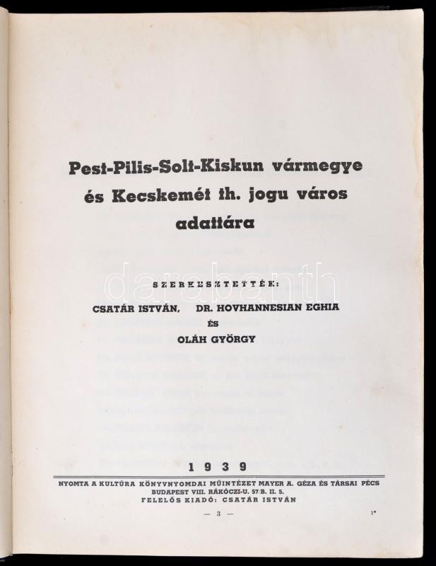 Pest-Pilis-Solt-Kiskun vármegye és Kecskemét th. jogú város adattára. Szerk.: Csatár István-Dr. Hovhannesian Eghia-Oláh György. Bp.-Pécs,1938, Kultúra Könyvnyomdai Műintézet - Mayer A. Géza és Társai, 172 + 164 + 136 (helyesen 236) p. Számos fekete-fehér fotóval. Kiadói egészvászon-kötésben, kopott, foltos borítóval, laza fűzéssel, foltos lapokkal, megviselt állapotban.