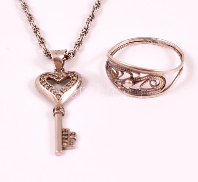 Ezüst (Ag.) lánc kulcs függővel, kő berakással, jelzett, h: 46,5 cm, bruttó 3,9 g + ezüst (Ag.) filigrán gyűrű, jelzett, méret: 52, nettó 1 g