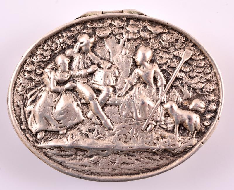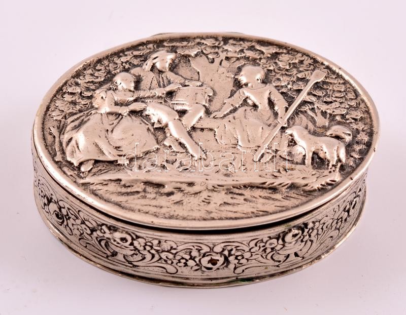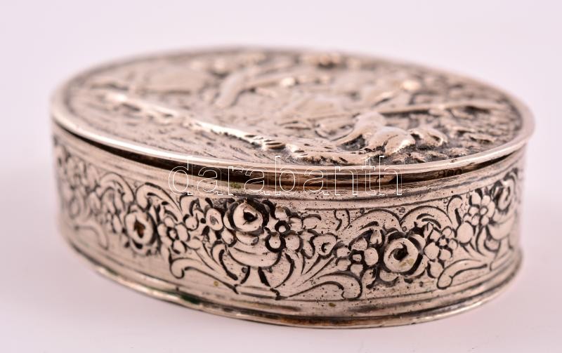 Ezüst(Ag) erdei jelenettel díszített, virágmintás szelence, jelzett, 6...