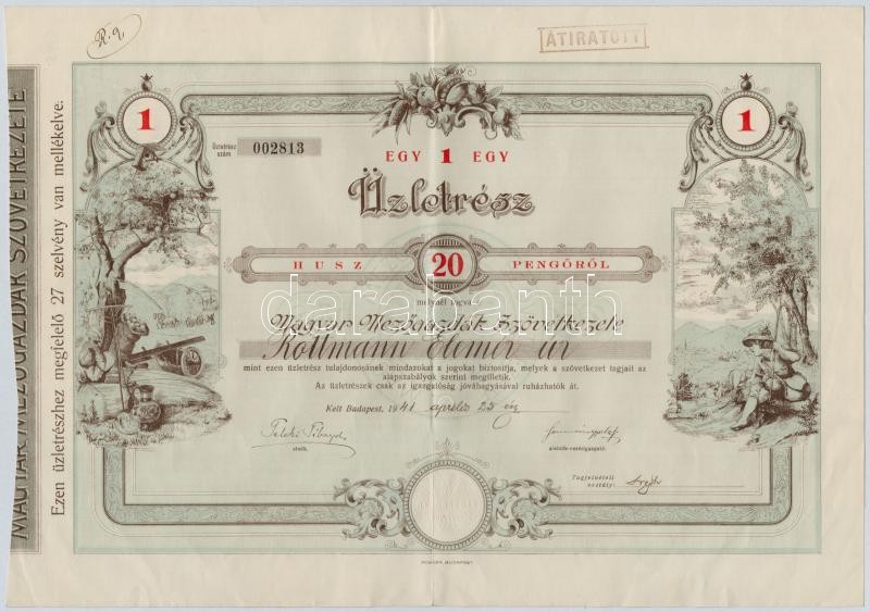 Budapest 1941. "Magyar Mezőgazdák Szövetkezete" névre szóló üzletrész jegye 20P-ről, szárazpecséttel, szelvényekkel és "ÁTIRATOTT" bélyegzéssel T:II-,III