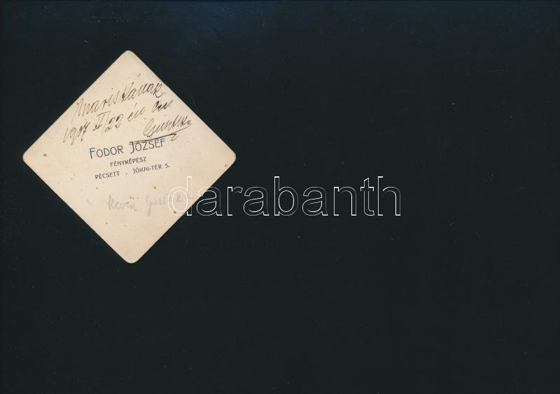 Description: 1907 Hevesi Gusztika (1884-?) színésznő (férje Sziklai József színész) fotója, keményhátú fotó, hátoldalon saját kezű dedikációjával, Fodor József pécsi fényképész műterméből, 6×6 cm