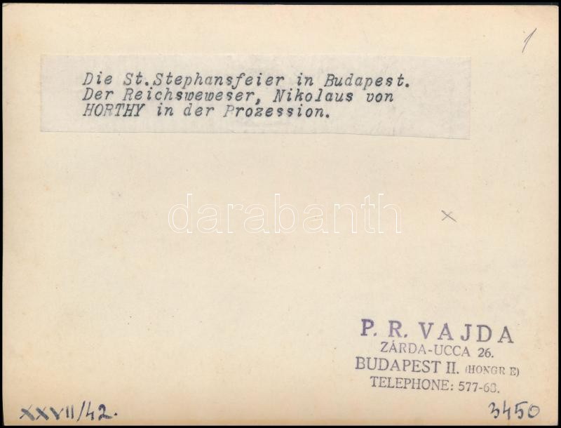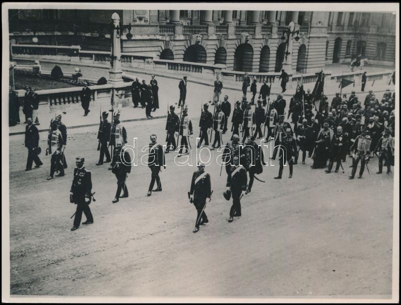 Description: 1938 Szent István napi ünnepi felvonulás Budapesten, élen Horthy Miklós kormányzó és a katonai vezetők a testőrség díszfala között, Vajda fotó, hátoldalon pecséttel jelzett, feliratozva, 11,5×15 cm