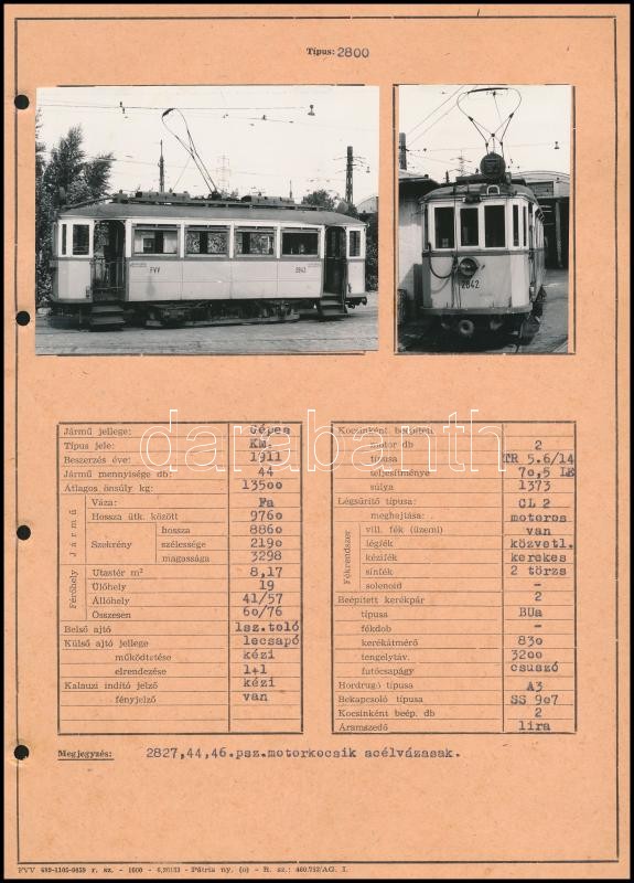 Fővárosi villamos elő- és oldalnézeti képe adatlapra ragasztva, 8,5×5,...