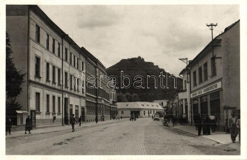 Huszt, Chust; Fő utca, vár, Vinohradi Városi Takarékpénztár, gyógyszertár / main street, castle, savings bank, pharmacy