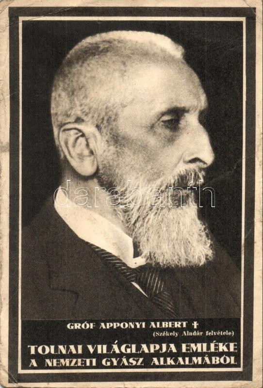 Gróf Apponyi Albert gyászlapja. Tolnai Világlapja emléke a nemzeti gyász alkalmából. Székely Aladár felvétele, hátoldalon információ / obituary card of Albert Apponyi (szakadások / tears)