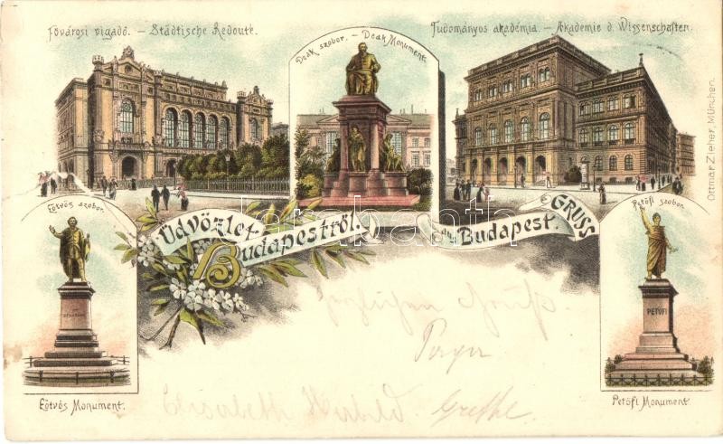 1898 Budapest V. Fővárosi vigadó, Deák szobor, Magyar Tudományos Akadémia, Petőfi szobor, Eötvös szobor. Ottmar Zieher Art Nouveau, floral, litho (b)