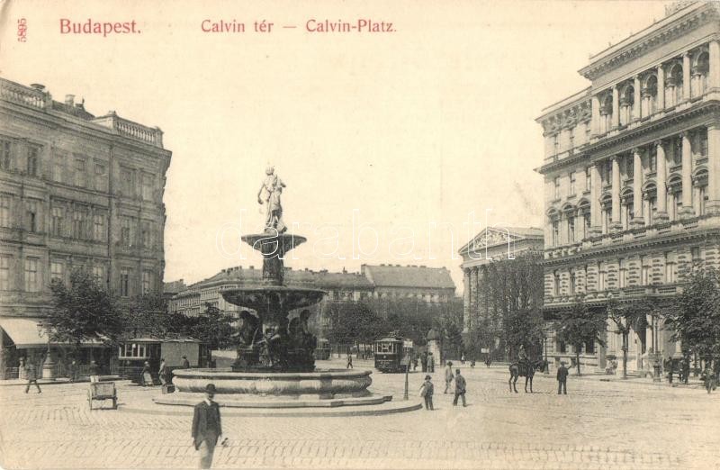 Budapest IX. Kálvin tér, szökőkút, villamosok, Nemzeti Múzeum, lovas c...