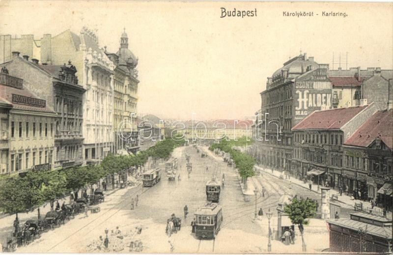 Budapest V. Károly körút, villamosok, Szőnyegáruház, Haldek reklám, Ágytollak, Auerback Mór üzlete