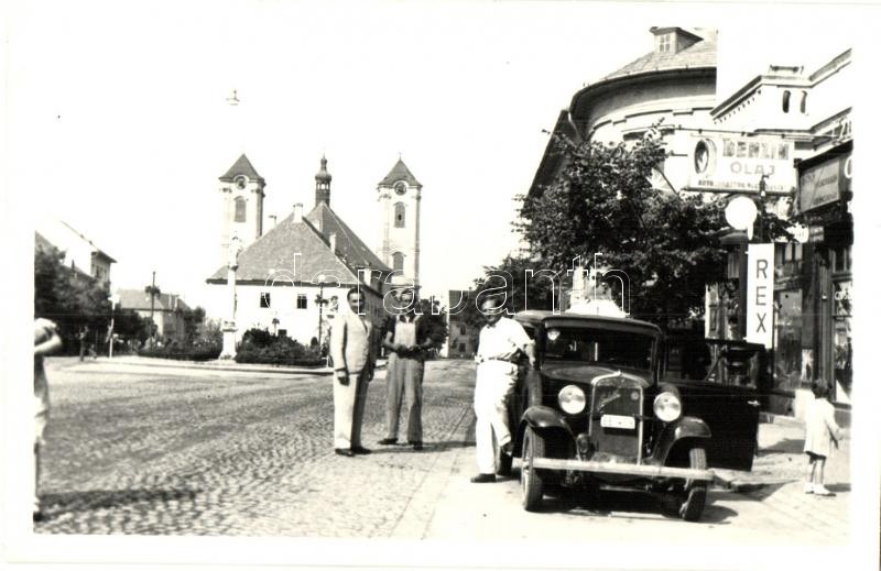 Gyöngyös, utcai Rex benzintöltő állomás, automobil, templom. photo