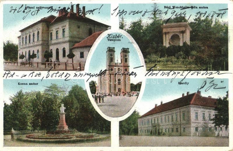 Kisbér, templom, Állami nagyvendéglő, Kozma szobor, Báró Wenckheim Béla szobra, kastély (EK)