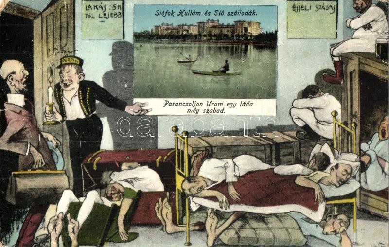 Siófok, Hullám és Sió szállodák. "Parancsoljon Uram, egy láda még szabad!" - humoros "Éjjeli szállás" montázslap (kopott sarkak / worn corners)