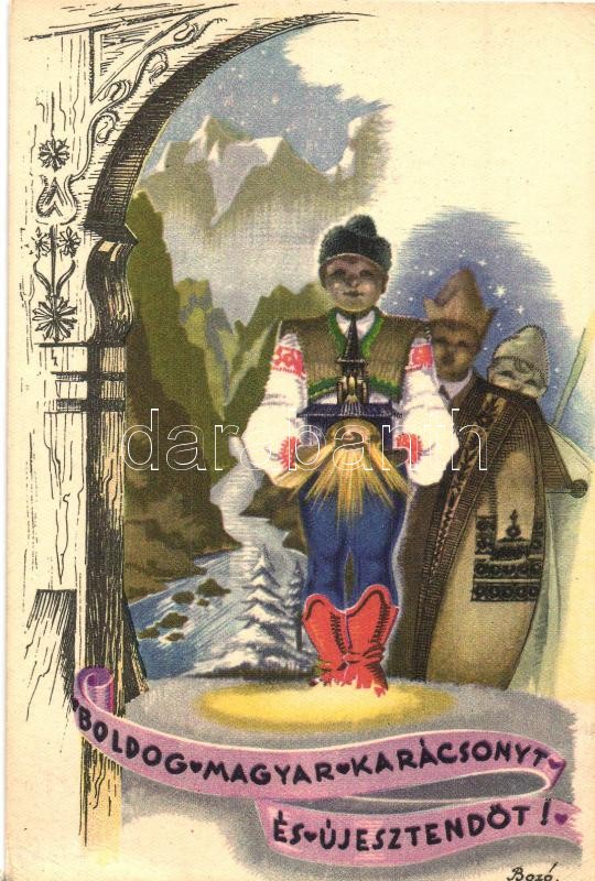 Boldog magyar karácsonyt és újesztendőt / Hungarian irredenta. Christmas and New Year greeting art postcard s: Bozó (EK)
