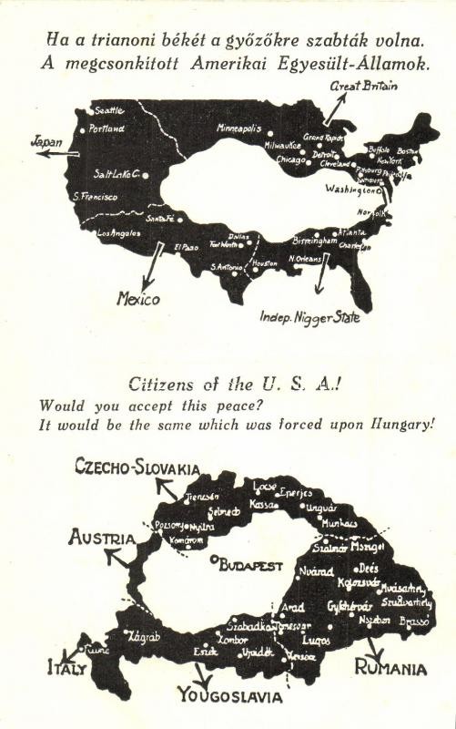 Ha a trianoni békét a győzőkre szabták volna. A megcsonkított Amerikai... https://www.darabanth.com/en/341-Online-auction/341.0/Postcards/Irredenta~1500060/Ha-a-trianoni-beket-a-gyozokre-szabtak-volna-A-megcsonkitott-Amerikai-Egyesult-Allamok-Kia~II1924217