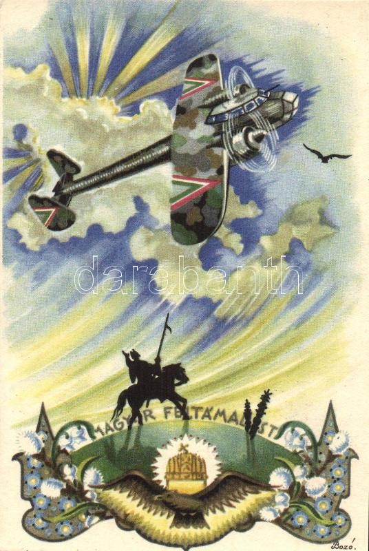 Magyar feltámadást! / Hungarian irredenta art postcard with aircraft s: Bozó