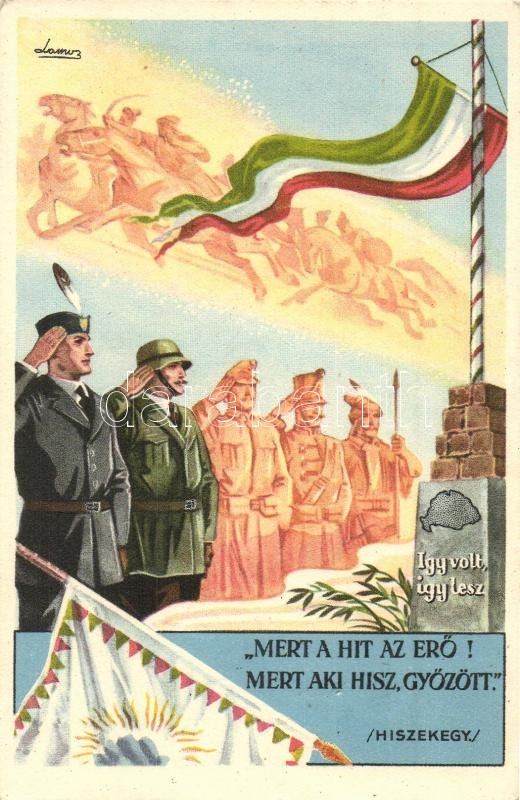 Mert a hit az erő! Mert aki hisz, győzött (Hiszekegy). Kiadja az Ereklyés Országzászló Nagybizottsága / Hungarian irredenta propaganda s: Lamoss