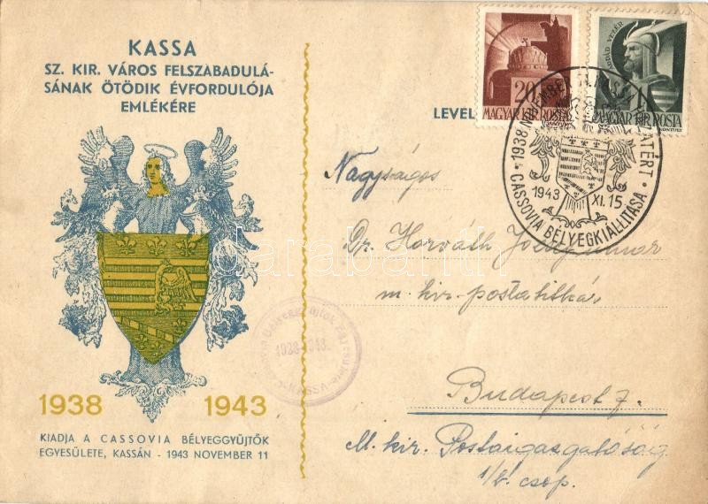 Description: 1938-1943 Kassa, Kosice; Sz. Kir. Város felszabadulásának ötödik évfordulója emlékére. Kiadja a Cassovai Bélyeggyűjtők Egyesülete / Memorial postcard for the 5th anniversary of the entry of the Hungarian troops, So. Stpl (EB)