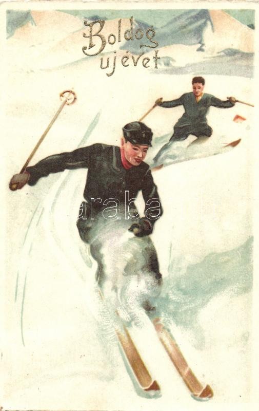 Boldog Újévet! / Men skiing, winter sport. B.R. Nr. 8405.