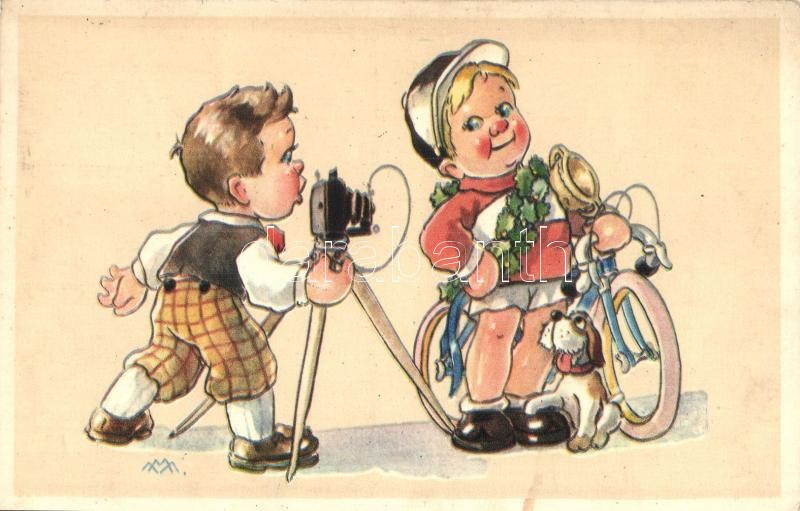 Boy cyclist with medal being photographed. Cecami N. 1066. Italian art postcard s: M.M.