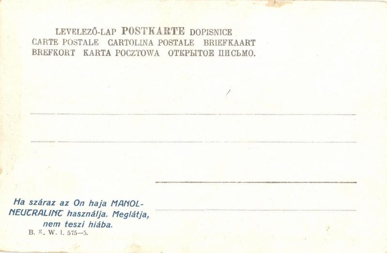 Description: Folklore couple attaching ice skates. winter sport. B.K.W.I. 575-5. Hátoldalon reklám "Ha száraz az Ön haja Manol-Neutralint használja, Meglátja nem teszi hiába." (Rb)