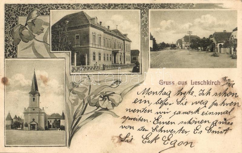 1912 Újegyház, Leschkirch, Nocrich; templom, utca, városháza / church, street, town hall. Art Nouveau, floral