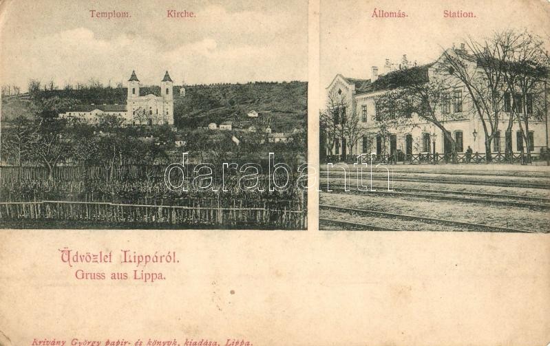 Lippa, Lipova; templom, vasútállomás. Krivány György kiadása / church,...