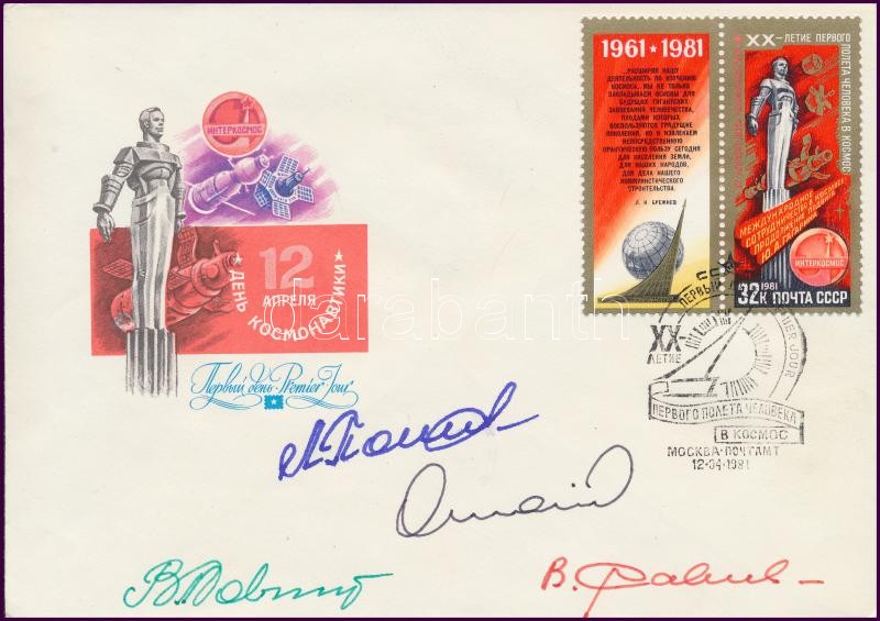 Description: Leonyid Popov (1945- ), Vlagyimir Kovaljonok (1942- ), Viktor Szavinih (1940- ) szovjet és Dumitru Prunariu (1952- ) román űrhajósok aláírásai emlékborítékon /