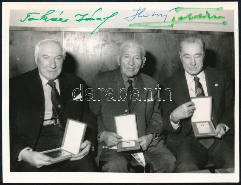Description: cca 1970-1980 Takács II József (1904-1983) háromszoros magyar bajnok, ötszörös gólkirály labdarúgó aláírt fotója, rajta további két azonosítatlan személlyel és azok aláírásaival, 9x12 cm