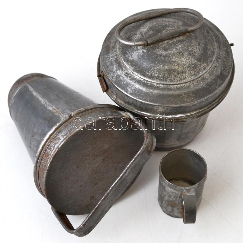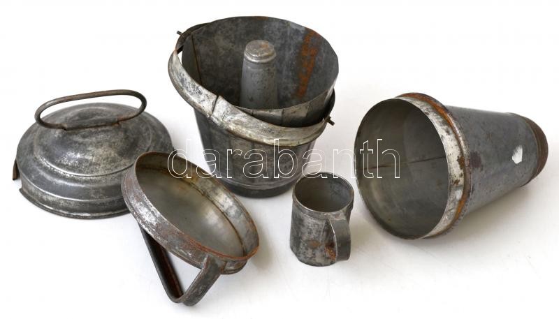 3 db régi ón lemezes konyhai eszköz: kis bögre, fedeles kuglófforma, t...