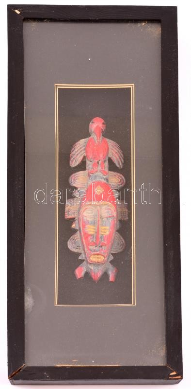 Keretezett, faragott törzsi díszmaszk, üvegezett fa keretben, 20×6 cm