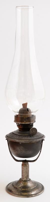 Régi petróleumlámpa üveg búrával, jelzett, m: 33 cm