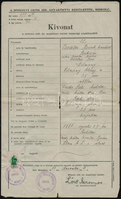 https://www.darabanth.com/en/342-Online-auction/342.0/Art-and-other-collectibles/Judaica~500025/1939-Miskolc-az-izraelita-hitkozseg-hazassagi-anyakonyvi-kivonata-okmanybelyeggel~II1924915
