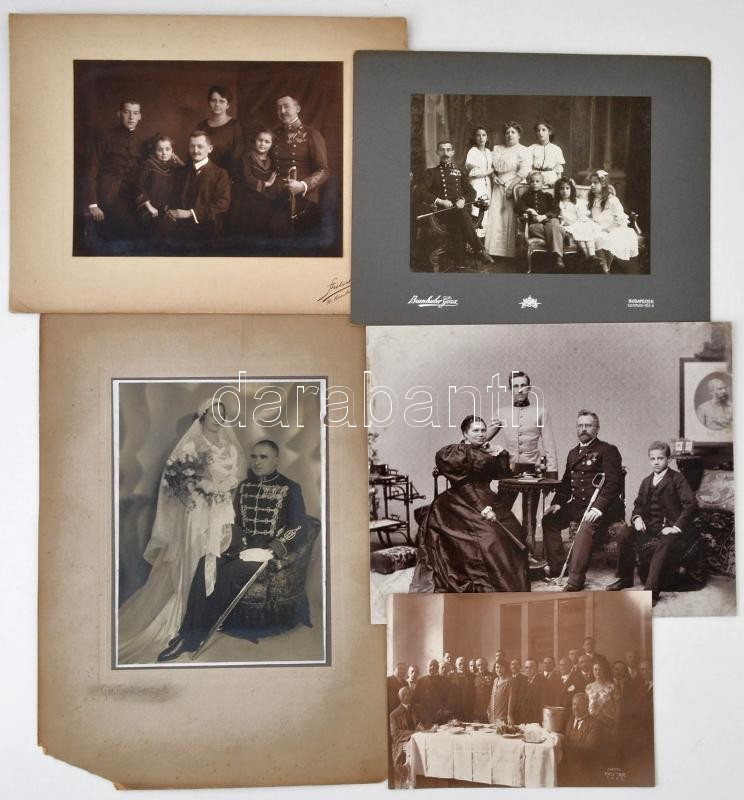 Description: Katonák családi és/vagy baráti körben, sok kitüntetéssel, különféle helyszíneken és eltérő időpontokban készült 5 db vintage fotó, többsége jelzett, 16x22 cm és 24x30 cm között