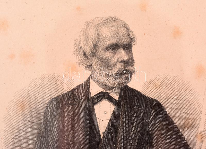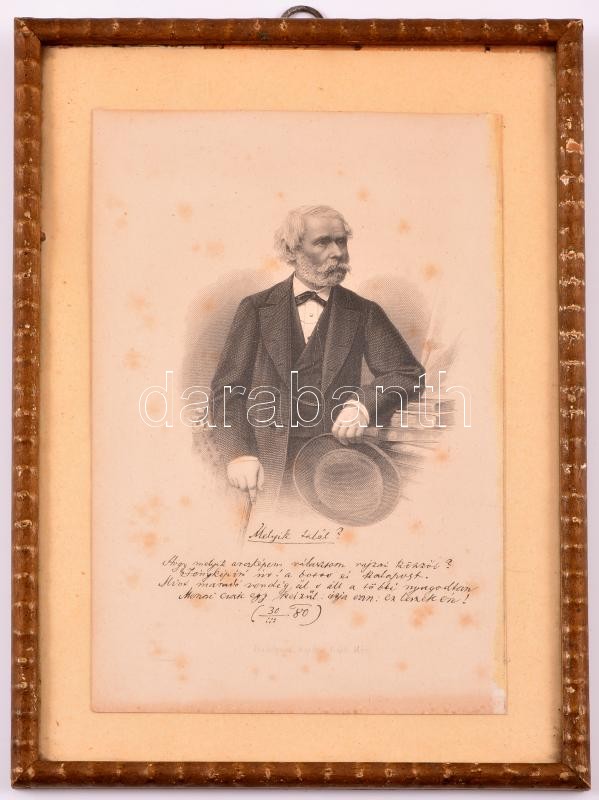1880 Arany János (1817-1882) költő, tanár, Kisfaludy Társaság igazgatója, MTA főtitkár arcképe, nyomtatott kézírással, üvegezett fa keretben, 20x13 cm