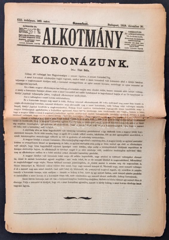https://www.darabanth.com/en/342-Online-auction/342.0/Art-and-other-collectibles/Printed-Materials~500030/1916-Alkotmany-XXI-evf-362-sz-1916-dec-20-Papirkotes-szakadozott-Koronazasi-szam-~II1929862