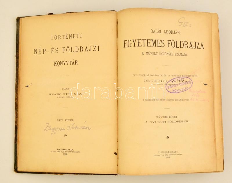 Balbi Adorján: Egyetemes Földrajza a művelt közönség számára Átdolg. és kibőv. Czirbusz Géza. II. kötet A nyugoti földségek. A szövegbe nyomott számos ábrázolattal. Nagybecskerek, 1894, Pleitz Fer. Pál. Korabeli, enyhén sérült gerincű félvászon kötésben.