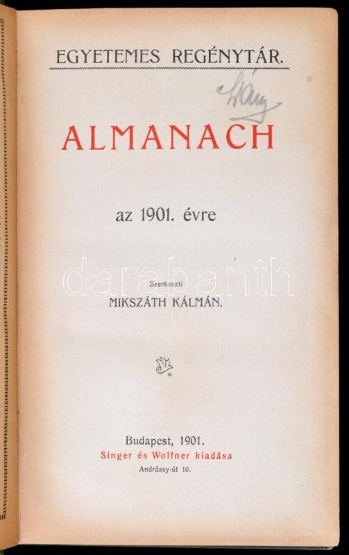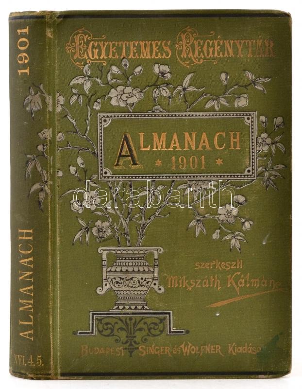 Egyetemes Regénytár. Almanach az 1901. évre. Szerk.: Mikszáth Kálmán. Bp., 1901, Singer és Wolfner. Kiadói aranyozott, festett, illusztrált zöld egészvászon, Gottermayer-féle kötés, márványozott lapélekkel, kissé kopott, kissé foltos borítóval.