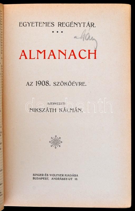 https://www.darabanth.com/en/342-Online-auction/342.0/Books/Books-Other-rarities~1000019/Egyetemes-Regenytar-Almanach-az-1908-evre-Szerk-Mikszath-Kalman-Bp-1908-Singer-es-Wo~II1926036
